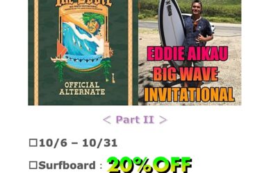 『この大会には世界で認められた唯一のビッグウェーバーでなければ招待されることはないのですから、世界中のサーファーにとって偉大なエディーに招待されることは目標であり大変名誉なことなのです。 今年も Chad san が招待されることは大変嬉しい今年最大のビッグニュース、これは I-MODE-D のセールスポリシーに反してでも、この嬉しいニュースを今年最初で最後の ” 大特価祭り ” で盛り上がるしかないっしょ!と企画しました。』 * 待っていても次回はありません!あくまでも今回が特別なので絶対にお見逃しのないように♪ * Sur