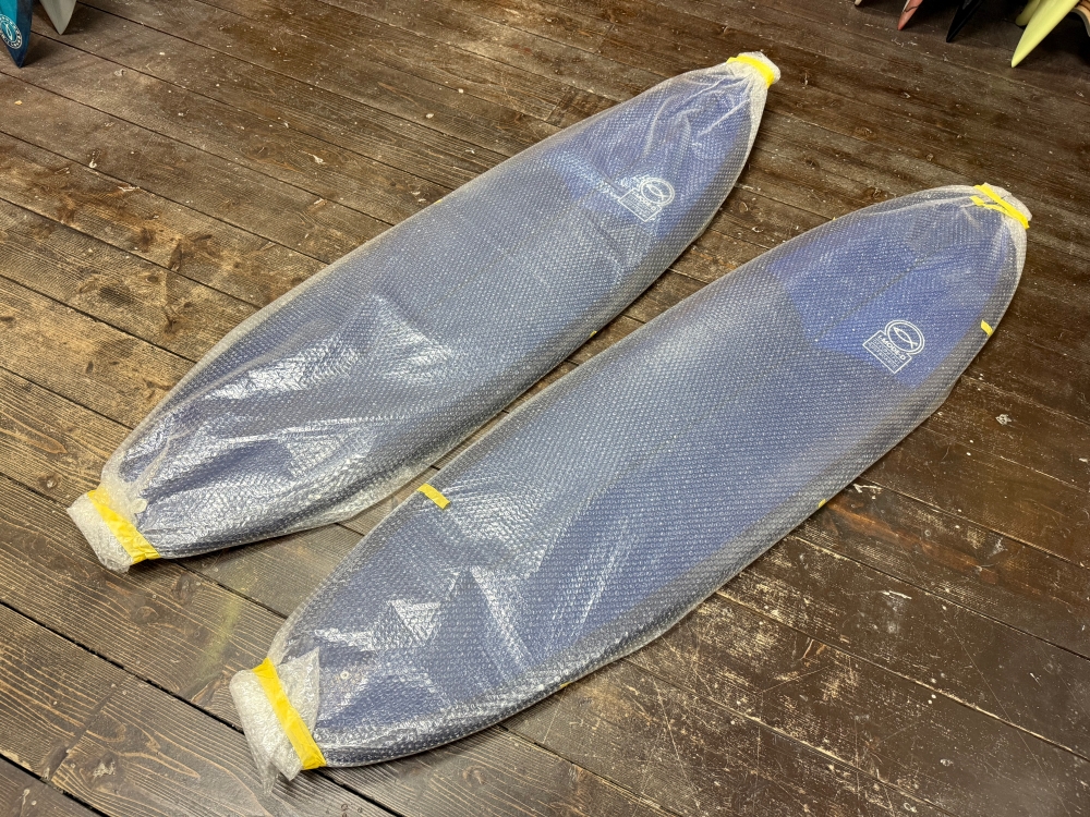 この写真を見て「あらっ!」と気がついた方もいらっしゃることでしょう。 「はい、その通りです♪」 の、ニューボード2本。 HYBRID JENNIFER 6.5 と Jigen 6.8 です。