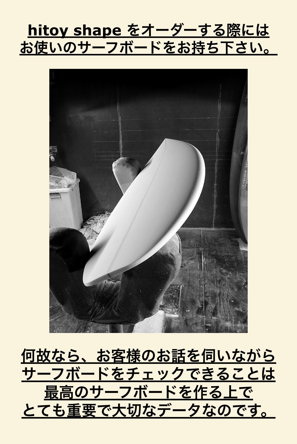 Shaper's Voice シェーパーとカスタマーの ” 究極のオーダースタイル “。 01/19/2026 Hitoy 12 Views シェーパーがオーナーという究極のスタイルで、カスタマーとの緻密なコミュニケーションのもとに1本1本丁寧にハンドフィニッシュでサーフボードを作り上げています。