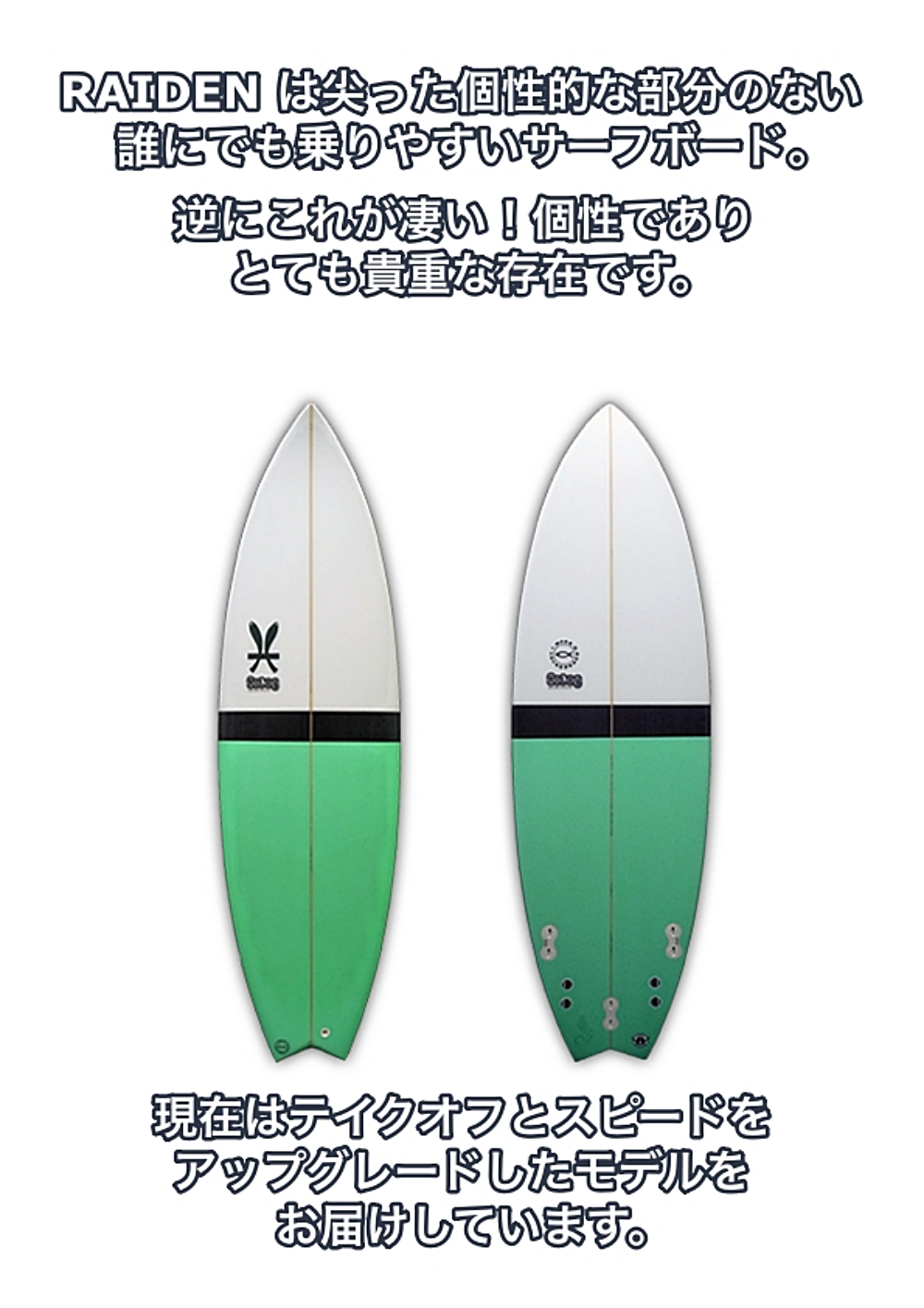 尖っていないという類まれな個性?から、リリース当時は I-MODE-D のサーフボードシーンにおいてユーザーの皆様に支持され売れまくった RAIDEN。